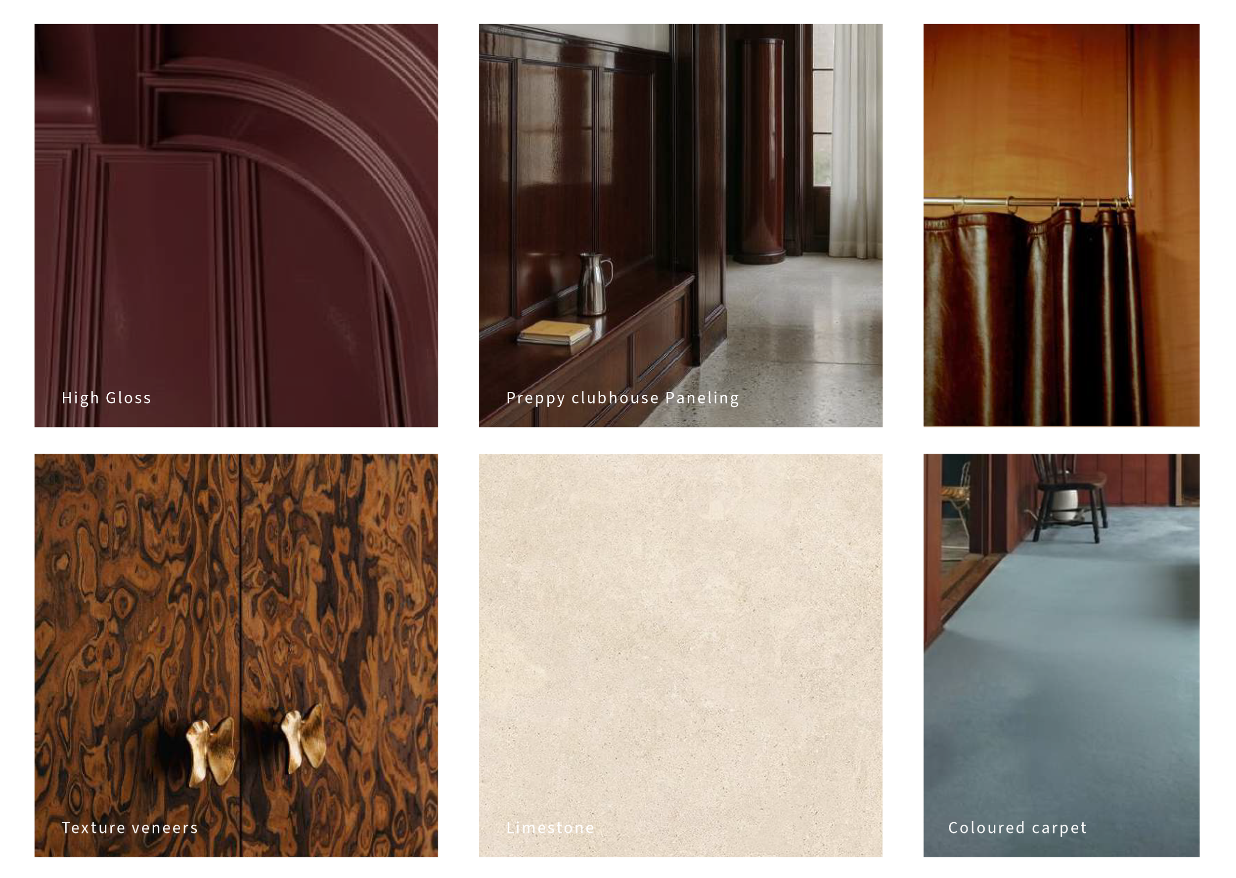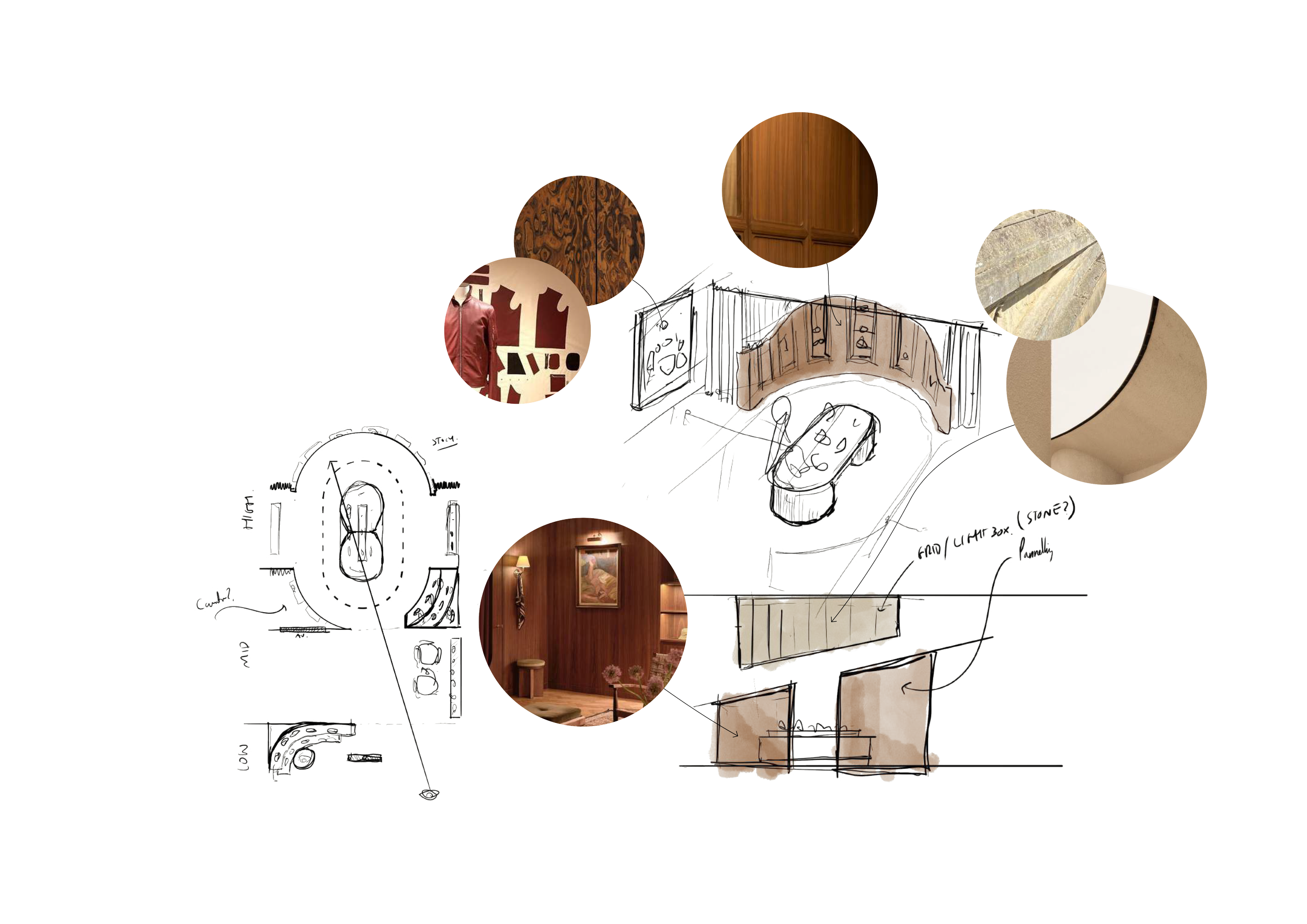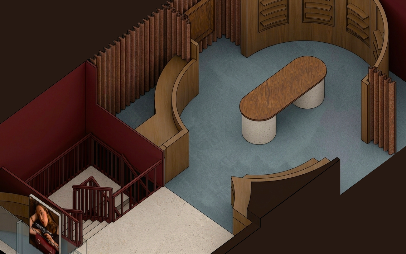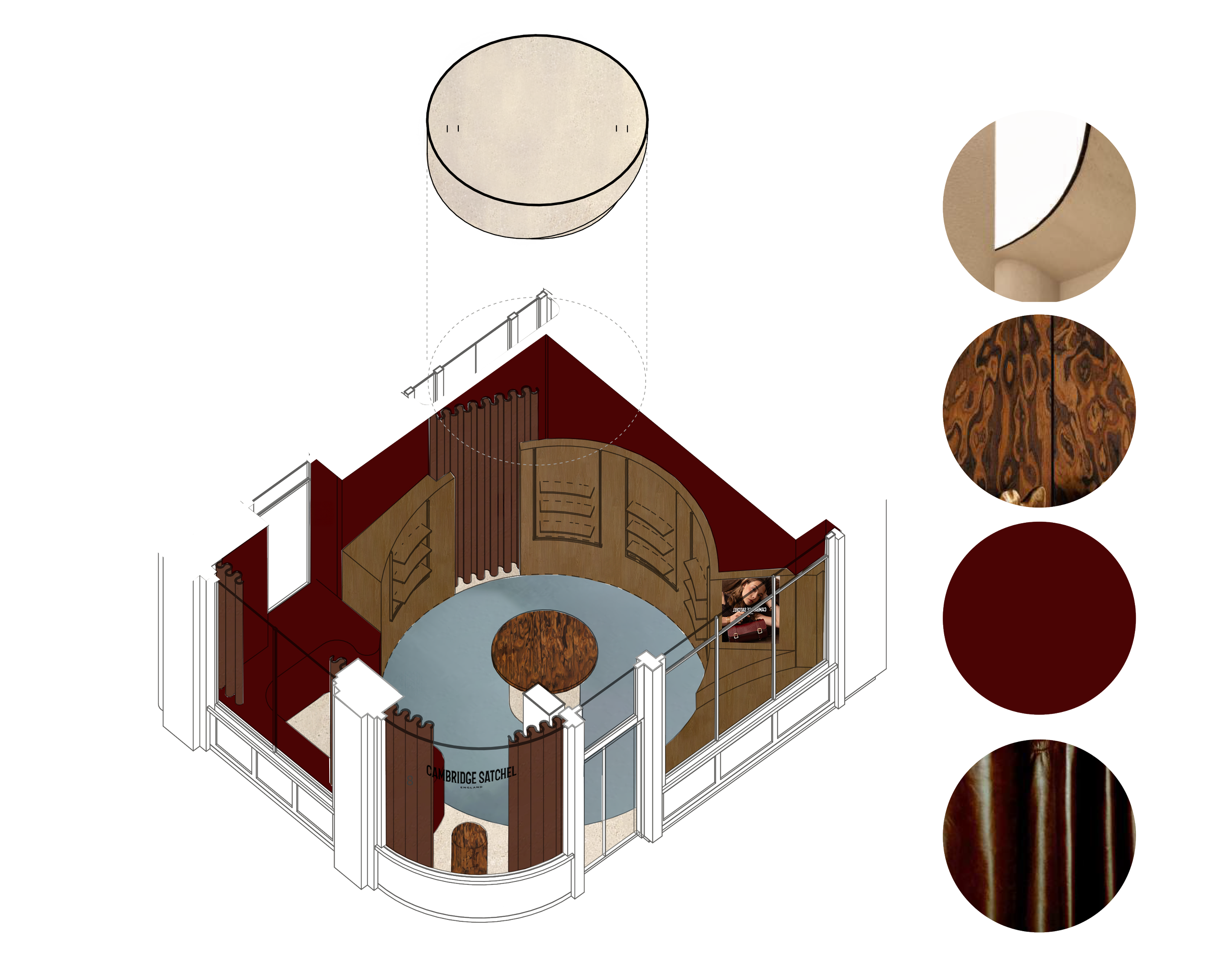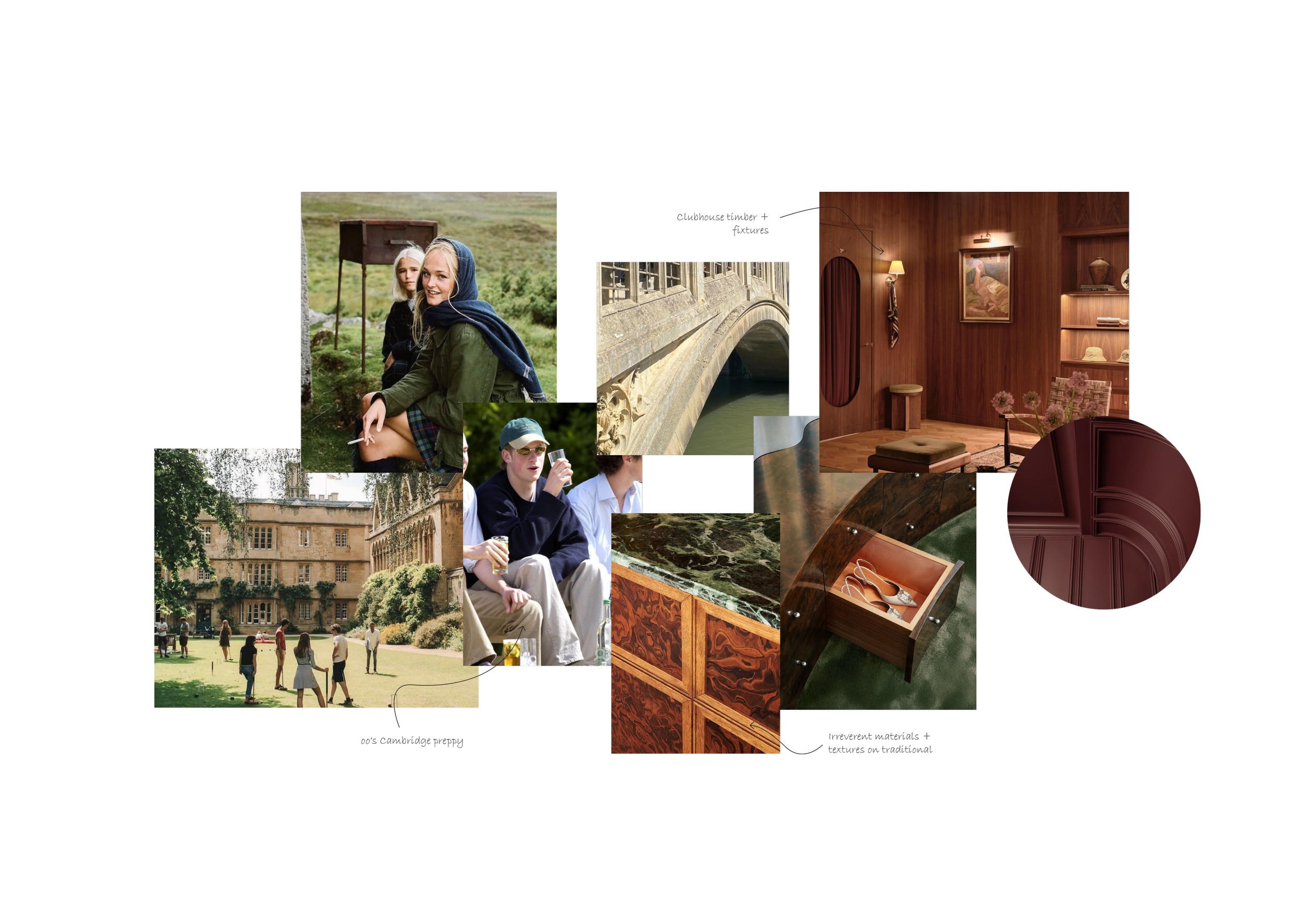 We developed two concepts; one embraces its founding in 2008 by being inspired by the 00s preppy "IT-girl," twisting Cambridge classicism with playful irreverence and polished rebellion. Traditional shapes and detailing you would find at Cambridge University are utilized, but with irreverent textures and materials; polished surfaces, overly textured veneers, and coloured carpets, while architectural-scale elements give the space presence.