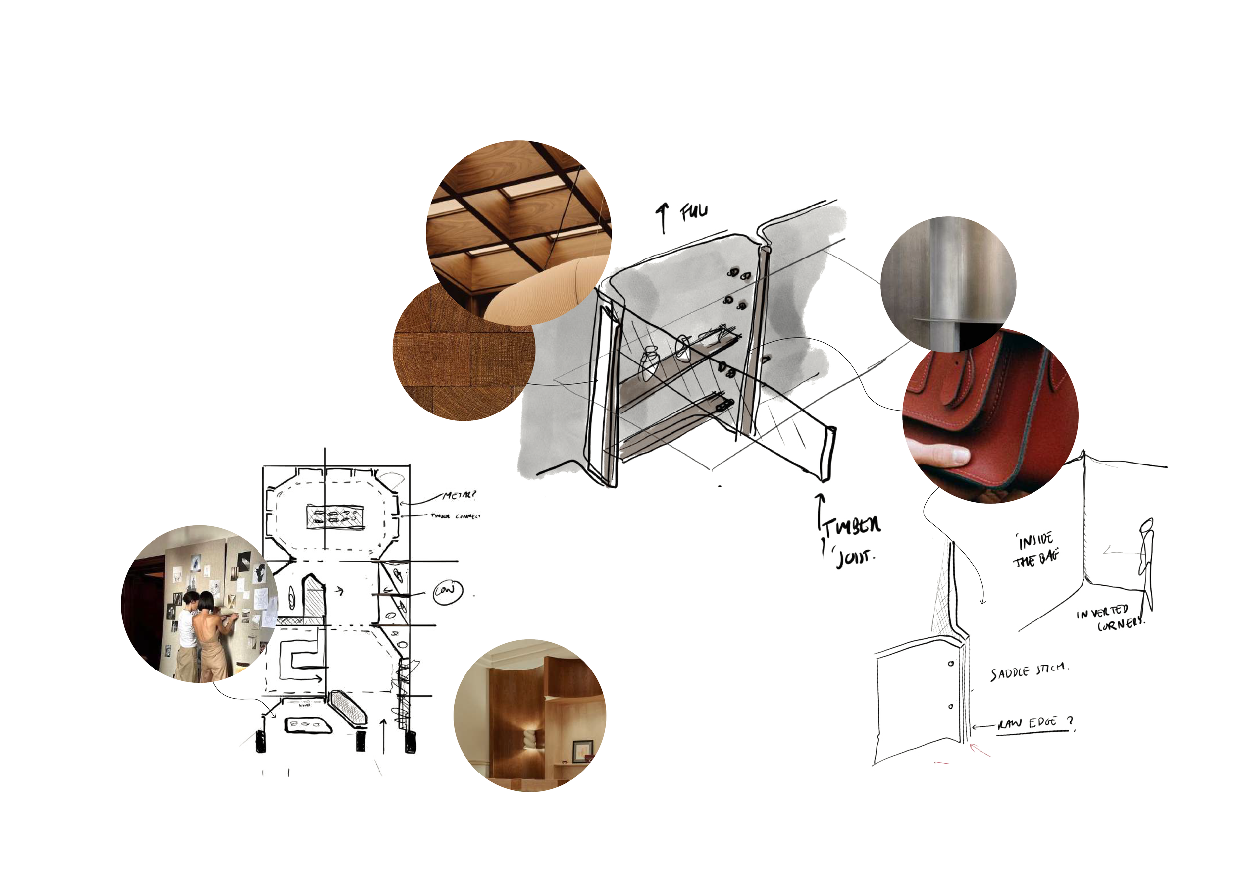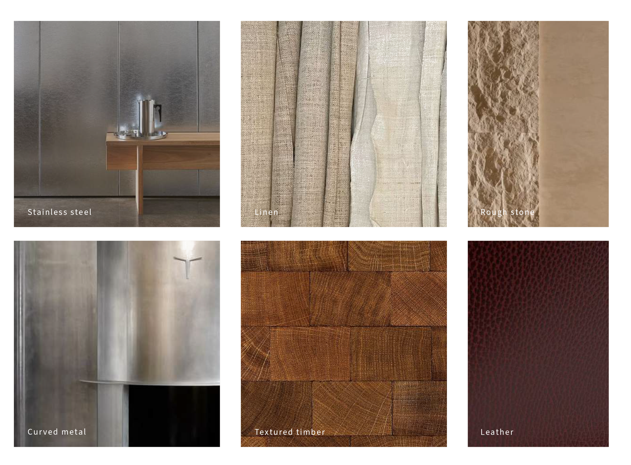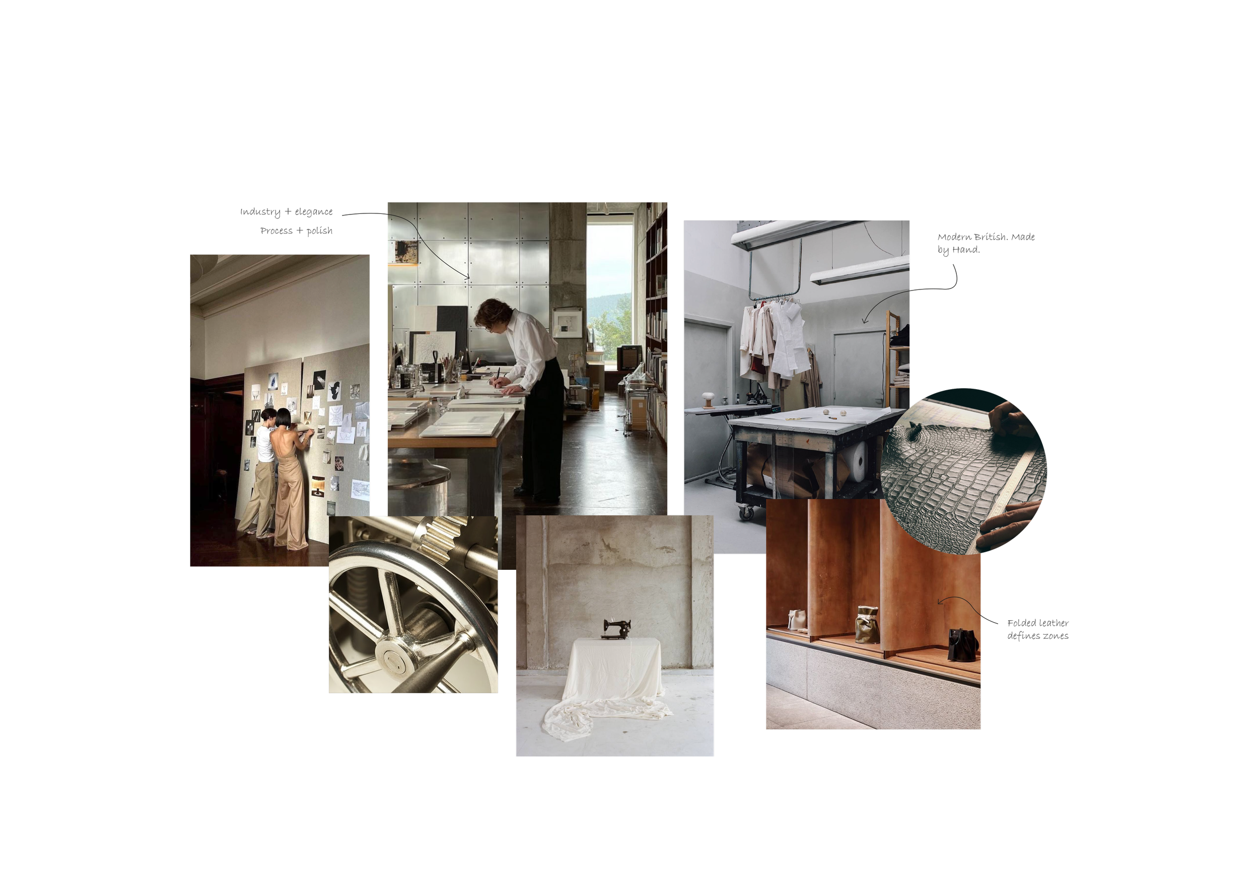 The other concept—Editorial Cool meets English Industrial Craft: a raw, brutalist setting softened by the warmth of leather, where craftsmanship is curated with the confidence of a fashion story. A modern fashion "workshop," where smooth utilitarian metal surfaces mixed with textured timber give the spaces a refined but also lived-in feel. Draped linens and stretched leathers contrast and soften the environment.